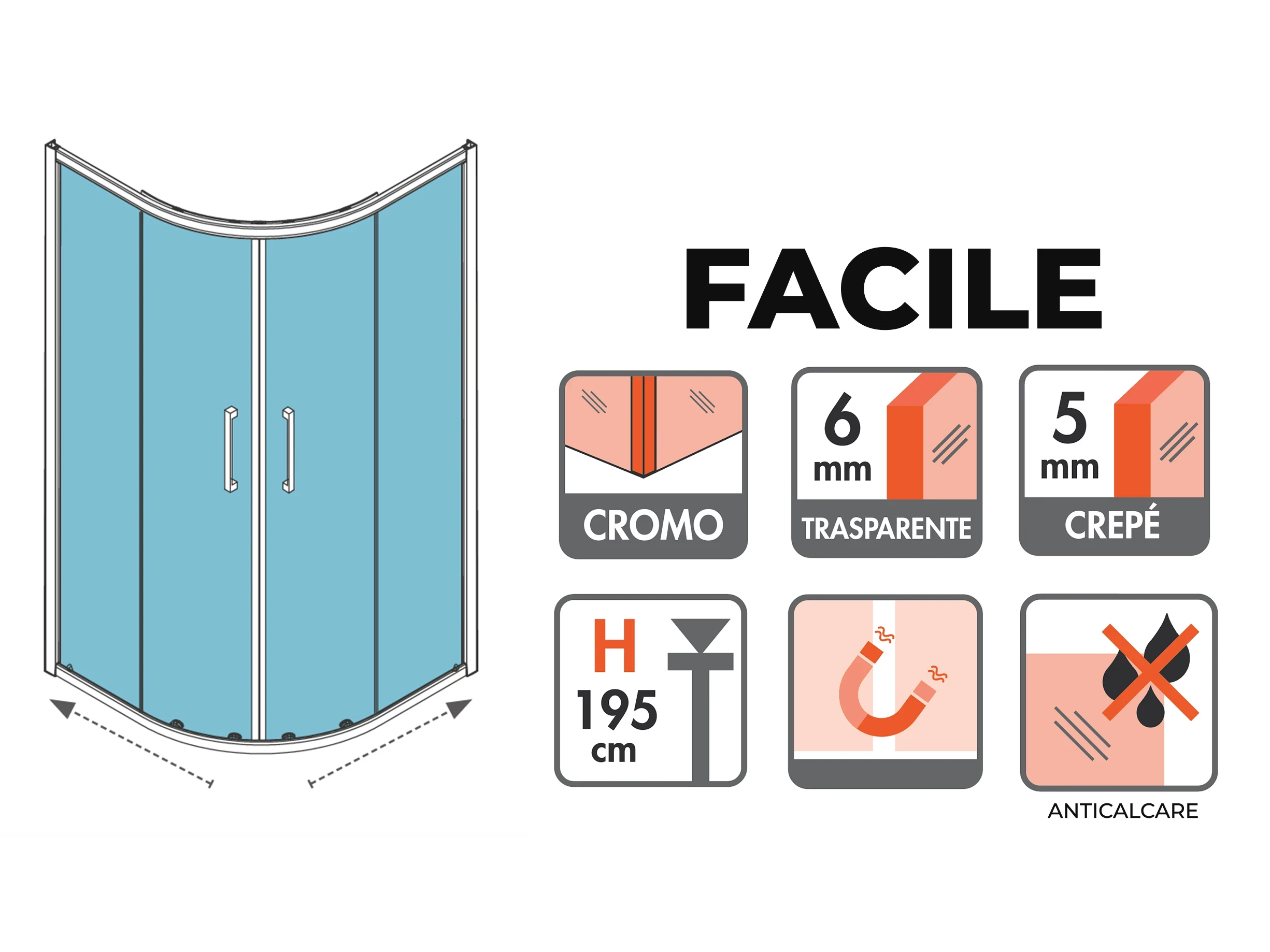 Box doccia semicircolare Facile Rain Box dotato di sistema Clackbox, realizzato con finitura anticalcare in cristallo trasparente e in cristallo crepé con profilo in alluminio cromato lucido. Facile Rain Box ti accoglie in un ampio spazio rilassante grazie alla comoda apertura delle ante semicircolari scorrevoli su cuscinetti dotate di sistema con guarnizione a chiusura magnetica. Grazie al facilissimo sistema di montaggio ad incastro Clackbox, Rain Box consente di montare i box doccia in modalità fai-da-te risparmiando fatica e ore di lavoro. Facile è un box doccia in alluminio cromato lucido alto 195 centimetri, prodotto in cristallo trasparente spesso 6 millimetri e in cristallo crepé spesso 5 millimetri. Rain Box lavora questi box doccia tramite un trattamento anticalcare che permette all'acqua di scivolare sulle superfici, senza essere ostacolata dai residui calcarei, preservando nel tempo trasparenza e brillantezza.
