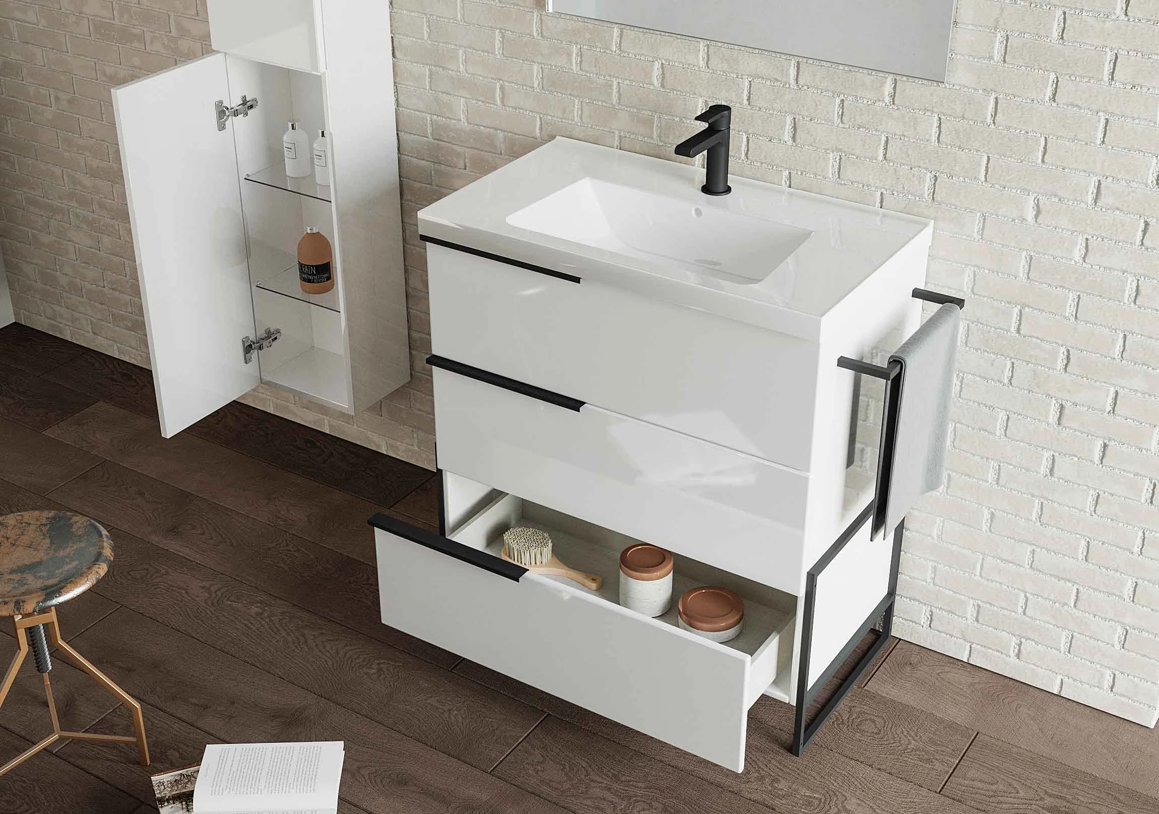 Mobile da bagno su base a terra Febe Savini dotato di 3 cassetti, lavabo in ceramica con spalla alta, portasalviette in metallo antracite opaco e disponibile in misura da 60, 80 o 100 centimetri. Febe è un mobile di arredo bagno con altezza 94 cm e profondità di 48 cm, compreso di maniglie, piedini e portasalviette in metallo con finitura antracite opaco. La linea Febe dei mobili Savini con 3 cassetti è la soluzione dal design contemporaneo che rende il bagno elegante e spazioso attraverso la composizione che può essere selezionata con larghezza 60, 80 o 100 cm e disponibile in quattro colori: Bianco Lucido, Olmo Caffè, Quercia Naturale e Quercia Bianco.